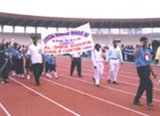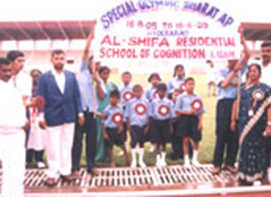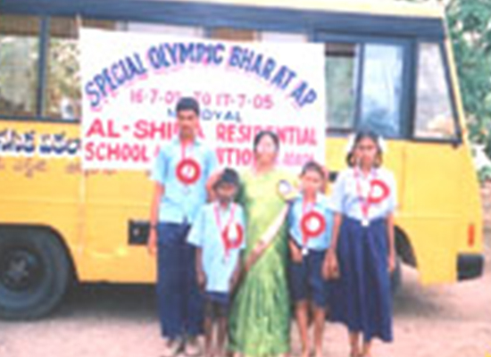 After being selected for state level Special Olympic Bharat, A.P., (state level) held at Hyderabad. The Mentally retarted children of our school assembled in the GMG Bala Yogi Studium "Gabchi goli" at Hyderabad along with S.Md. Rafi, Founder, Principal Smt. S. Sabirunnisa, and staff . 16/08/2005